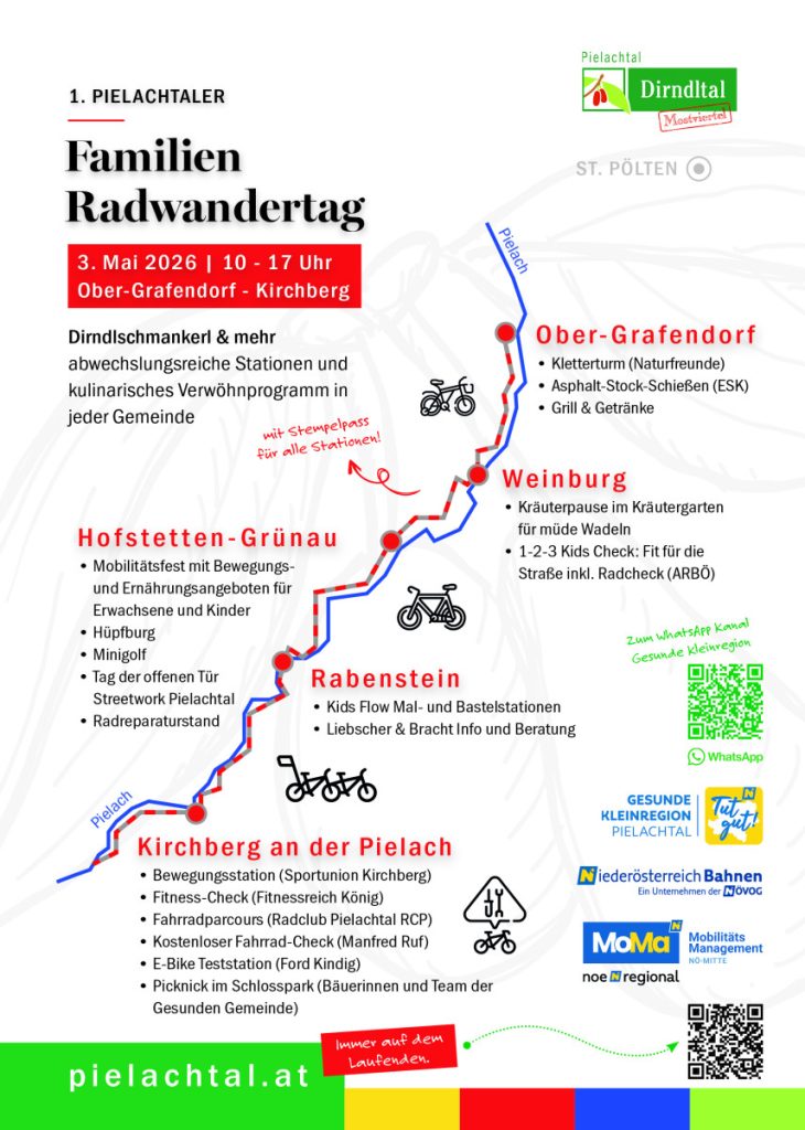 Aktivitätsstationen für Groß und Klein und Kulinarik in den Gemeinden Ober-Grafendorf, Weinburg, Hofstetten, Rabenstein und Kirchberg an der Pielach.
